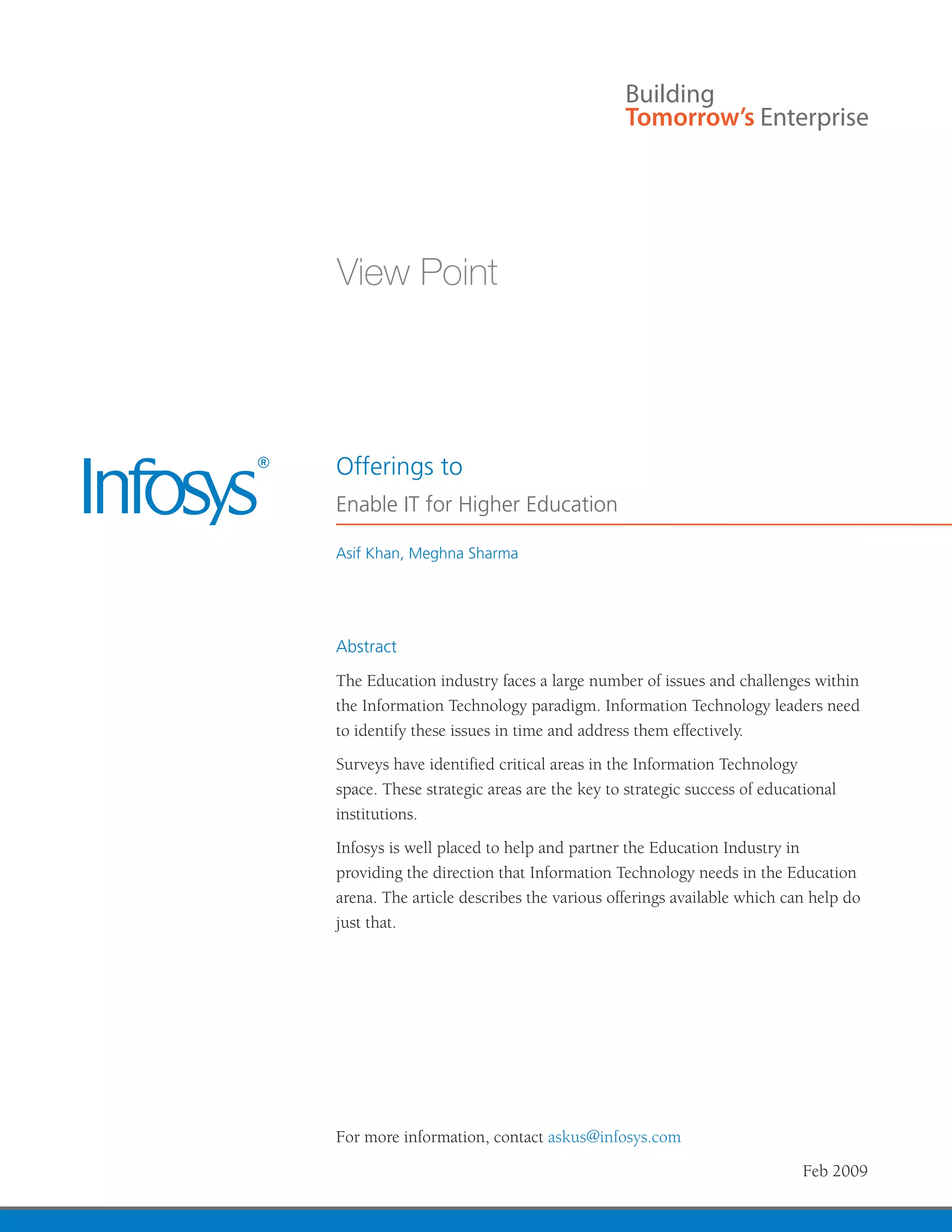 The document discusses the challenges facing information technology in higher education and the strategic areas that need to be addressed to ensure institutional success. It highlights Infosys' offerings and commitment to partner with educational institutions to tackle critical IT issues such as security, funding, identity management, and disaster recovery. The article emphasizes the importance of leveraging technology to enhance educational experiences while maintaining compliance with regulations and effectively managing resources.