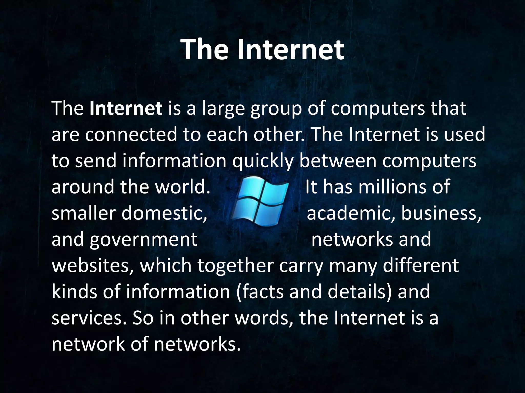 The Internet is a global network of interconnected computers that allows for the quick transmission of information around the world. It consists of millions of smaller networks, including academic, business and government networks, that carry different types of information and services.