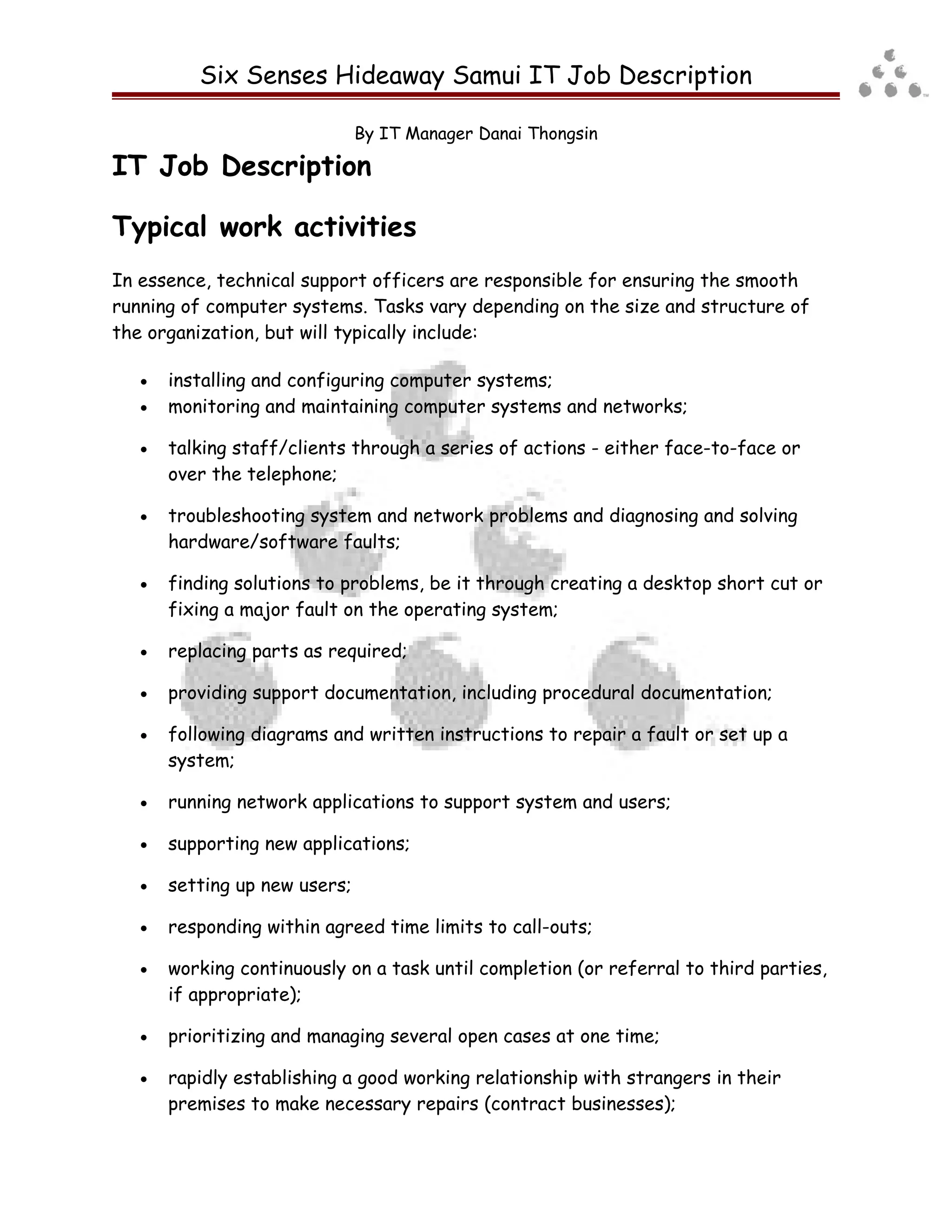 This job description outlines the typical responsibilities of a technical support officer at Six Senses Hideaway Samui. Key duties include installing and configuring computer systems, monitoring and maintaining networks and systems, troubleshooting hardware and software issues, providing support documentation, and responding to service calls to resolve IT problems for staff and clients. The role requires installing new systems, setting up users, testing new technologies, and ensuring computer equipment meets safety standards.