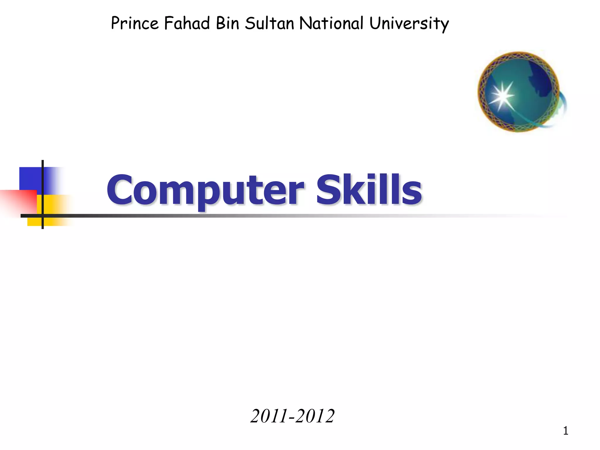 This document provides an overview of computer skills and components. It discusses [1] what a computer is and its basic functions of input, processing, and output. [2] It then explains the components of a computer system including hardware, software, and users. [3] The document delves into the various hardware components that make up a computer system such as the CPU, memory, storage, and input/output devices.
