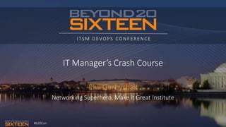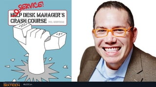 This document contains the presentation slides from a talk given by Phil Gerbyshak at the #b20Con ITSM DEVOPS CONFERENCE. The presentation covers various topics for IT managers including developing job descriptions and interview questions, implementing a performance review process, establishing a progressive discipline policy, measuring key metrics like customer satisfaction and employee productivity, and marketing the success of the IT service desk internally.
