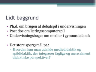 Lidt baggrund Ph.d.om brugen af debatspil i undervisningen Post doc om læringscomputerspil Undervisningsbøger om medier i gymnasiedansk Det store spørgsmål pt.: Hvordan kan man udvikle mediedidaktik og spildidaktik, der integrerer faglige og mere alment didaktiske perspektiver?