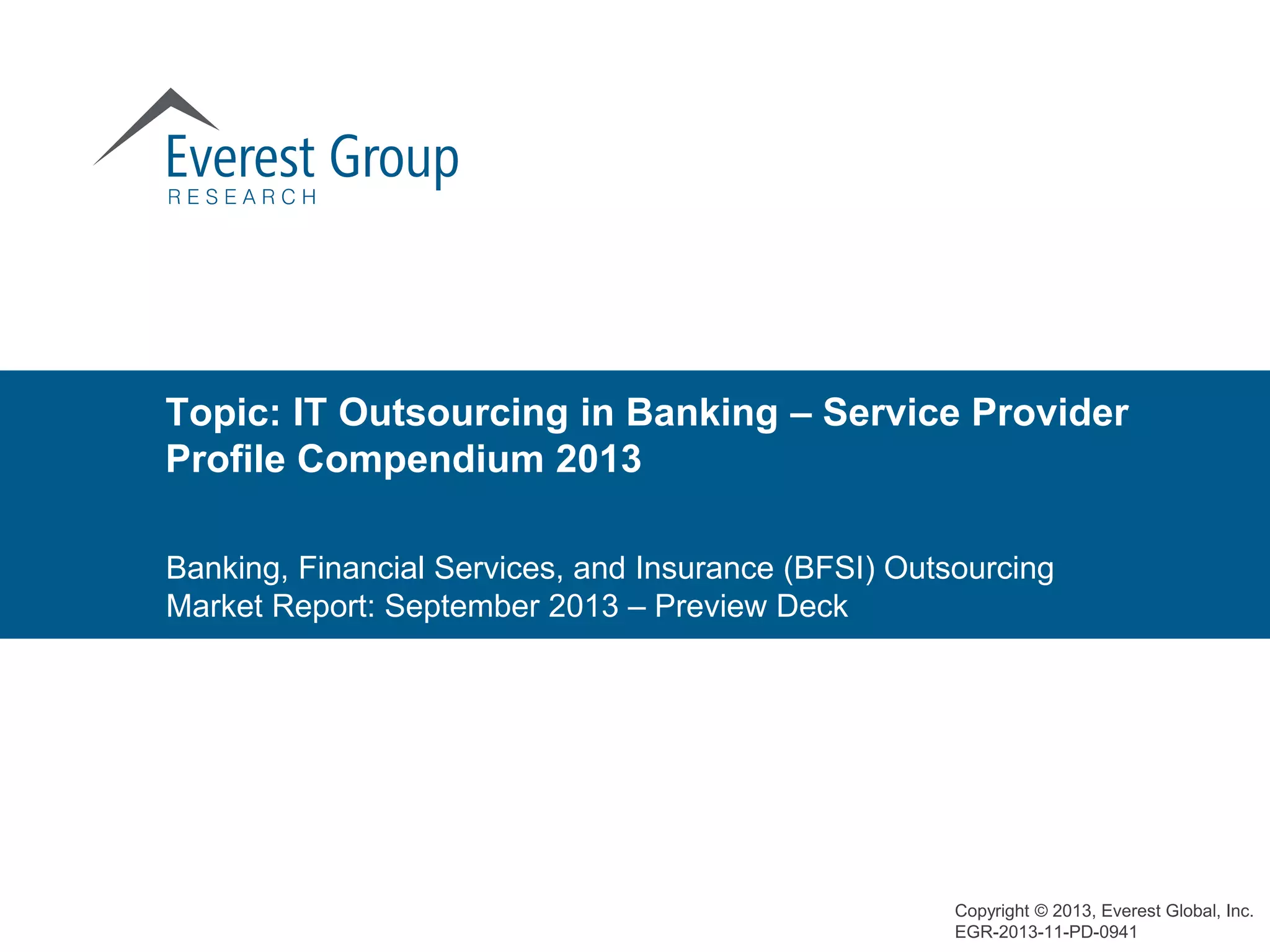 The document is a comprehensive report by Everest Group on IT outsourcing in the banking sector, specifically focusing on application outsourcing (AO) services within the banking, financial services, and insurance (BFSI) sectors. It provides detailed profiles of 28 key service providers categorized into leaders, major contenders, and emerging players, along with insights into market trends, competitive dynamics, and the evolving landscape of AO services. The report aims to deliver actionable intelligence for organizations looking to assess service providers' capabilities and value propositions in the BFSI AO market.
