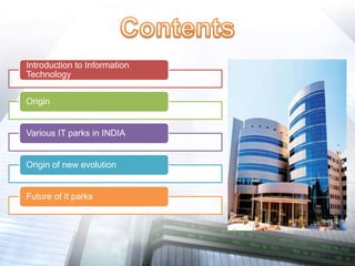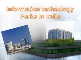 The document discusses the origin and growth of IT parks in India. It provides details on the first IT park established in India in Bangalore in partnership with Tata Industries, Singapore Consortium, and Karnataka Industrial Areas Development Board. It outlines the key IT parks established across major cities in India and the facilities and infrastructure provided in these parks. The future of IT parks and their role in promoting India as a global IT hub is also mentioned.