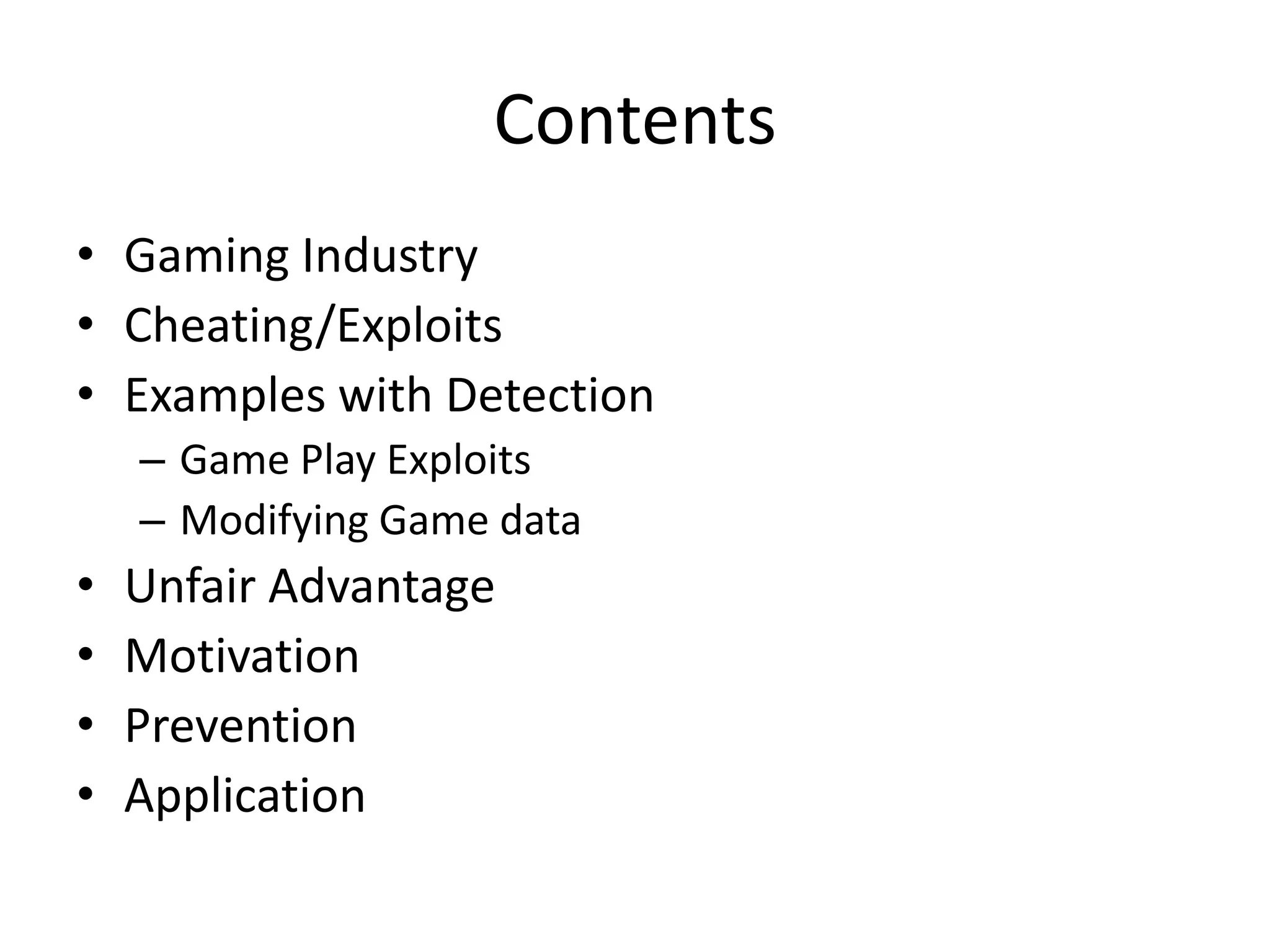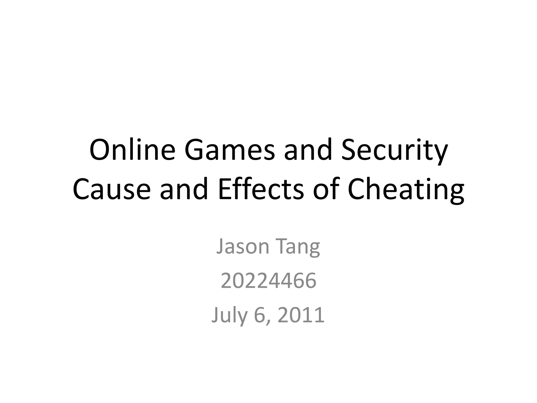 This document discusses cheating and exploits in online games. It begins by providing background on the gaming industry and types of games. It then describes two main types of cheating: exploiting game play mechanics and modifying game data. Exploits of game play include lag switching and stacking abilities. Modifying game data involves hacking for speed or aiming advantages. Cheating provides an unfair advantage and is motivated by the real-world value of in-game wealth or competitive prizes. Game developers try to prevent cheating through detection, patching vulnerabilities, and monitoring games. Overall, online game security faces similar challenges to other systems in identifying and addressing threats.