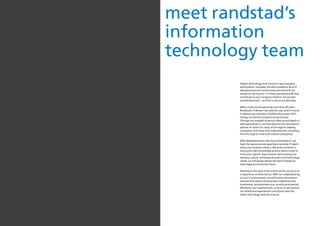 Randstad is an IT recruitment firm with over 20 years of experience. They have dedicated IT consultants with expertise in various technologies. Their competency-based approach matches candidates to roles based on skills. They focus on both local and international markets to find specialized skills. Randstad aims to understand clients' and candidates' needs to provide rewarding career experiences and support clients' changing IT needs.