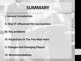 Uber has transformed the taxi industry through its use of information technology. It launched in 2009 as a mobile app that allows users to request rides from nearby drivers. Uber collects large amounts of user data through its app and has faced criticism over privacy and data security issues. While Uber has disrupted legacy taxi companies, new players may emerge using technologies like self-driving cars. Recommendations include improving customer loyalty, securing customer data, developing application controls, and informing customers clearly on data use.