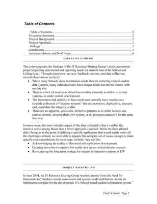 This report summarizes the findings of a needs assessment conducted by the IT Resource Sharing Group regarding operational and reporting needs for student data at the University of Washington. The assessment found that while Schools share many common information needs, they also have unique needs. It also found a lack of awareness about existing central systems and a proliferation of "shadow systems" developed by individual units. The report concludes there is high frustration over access to and analysis of student data. It recommends acknowledging decentralized systems and creating processes to support secure and productive development across the university.