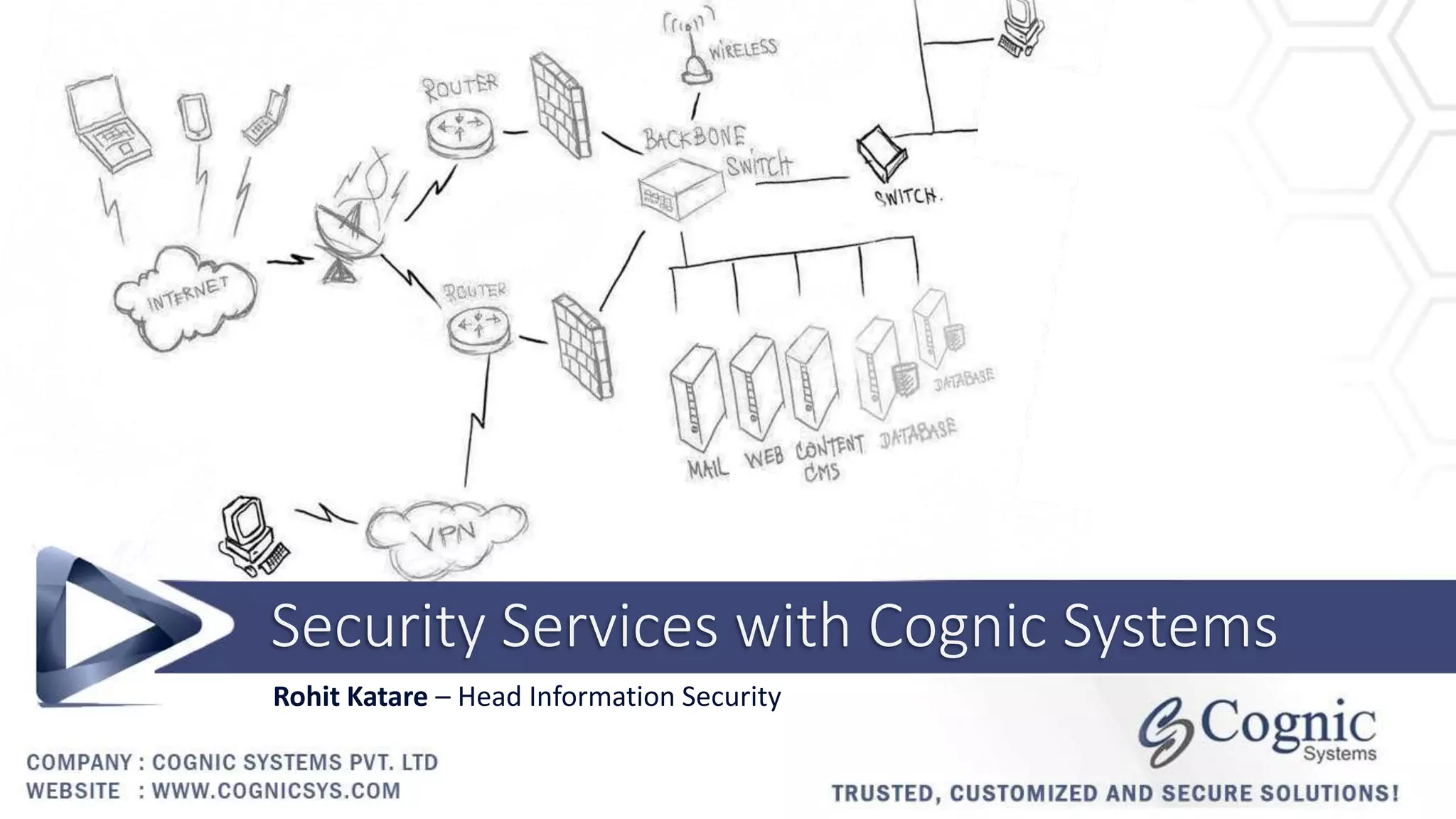 Cognic Systems provides a variety of information security services including penetration testing, vulnerability assessments, security audits, web application security testing, managed security services, and professional consulting services. Their security experts employ sophisticated tools and threat intelligence to help clients build effective security programs. Some of their key offerings are penetration testing to evaluate system vulnerabilities, vulnerability assessments to identify weaknesses, security audits to ensure compliance and catch problems, and web application testing to secure confidential data and applications from attacks.