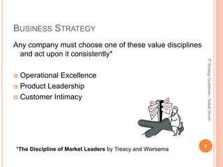 The document outlines IT strategy guidelines focusing on three main value disciplines: operational excellence, product leadership, and customer intimacy. It emphasizes the importance of aligning technology strategies with these disciplines, including internal process, development, and relationship technologies. It also provides questions for companies to consider when deciding on their technology and product development strategies.