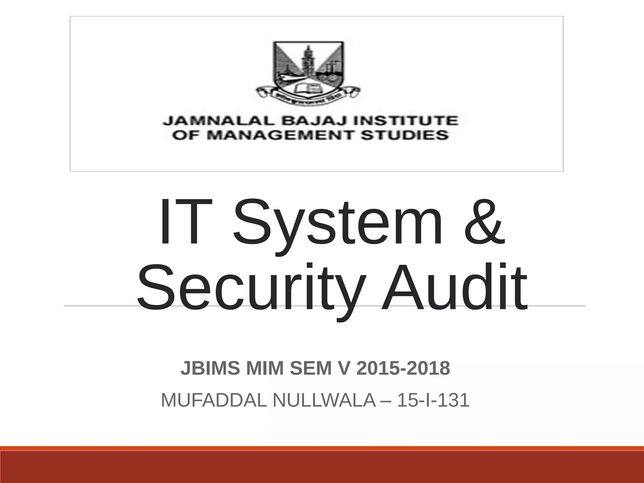 The document provides an overview of IT auditing, detailing the roles and responsibilities of IT auditors, the certifications offered by ISACA, and the phases of an IT audit including pre-audit, audit, and post-audit processes. It discusses various auditing techniques for applications and technology, emphasizing the importance of security, data management, and compliance during audits. Overall, it serves as a comprehensive guide for understanding IT audits and the standards for conducting them effectively.