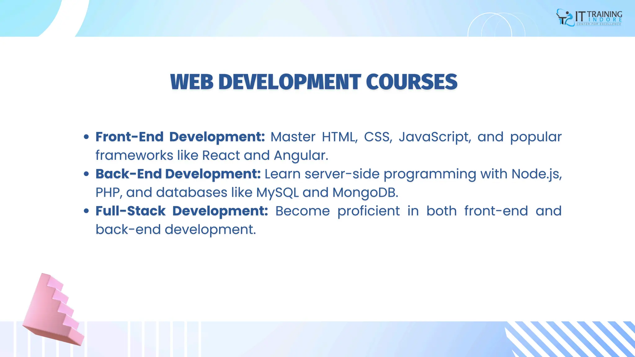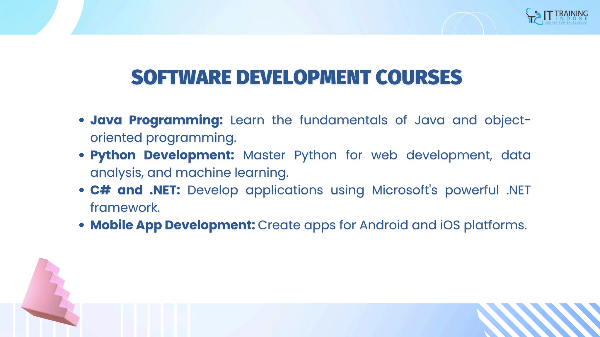 It Training Indore offers comprehensive IT education in India, focusing on empowering students and professionals with essential skills for the competitive industry. The organization provides a variety of courses, including software and web development, with a commitment to quality education, student success, and continuous improvement. For more information, they can be contacted at their office located in Indore.
