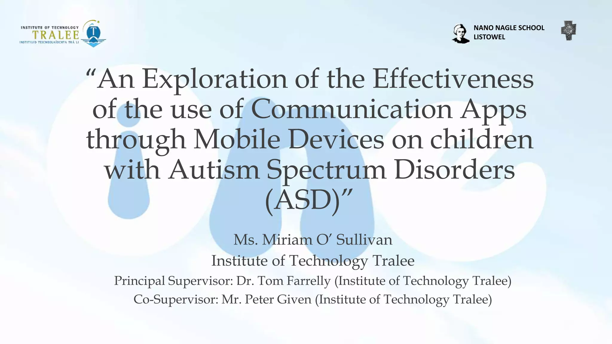 This document summarizes a research project exploring the effectiveness of using communication apps on mobile devices for children with autism spectrum disorder (ASD). The research aims to determine if children show a preference for using mobile devices over traditional communication folders, and to assess the impact of app and device use on children's lives at home, school, and in their communities. The research methodology involves user-centered design, mixed data collection methods including interviews, observations and questionnaires, and an action research framework. Initial findings suggest benefits of app and device use, but further data analysis and implementation phases are still underway. The researcher intends to present findings, pursue additional collaborations, and disseminate results through publications.