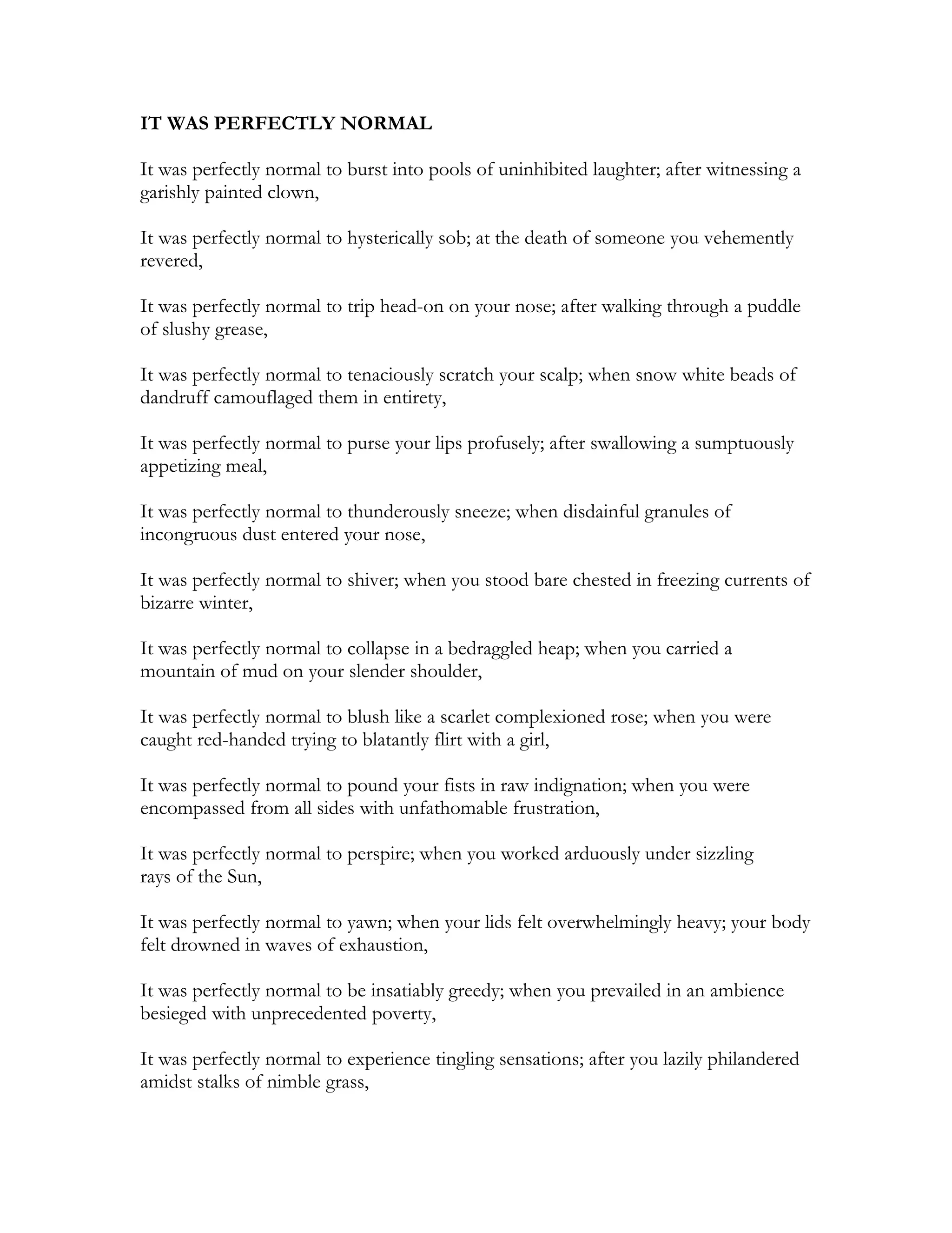 This document lists various normal human experiences and behaviors, including laughing at clowns, crying at death, sneezing from dust, shivering in the cold, sweating from work, yawning from exhaustion, feeling lust, and screaming during earthquakes. It argues that committing errors is also normal as long as one lives in harmony with nature, reveres God, loves their mother, and feels alive when loving another.