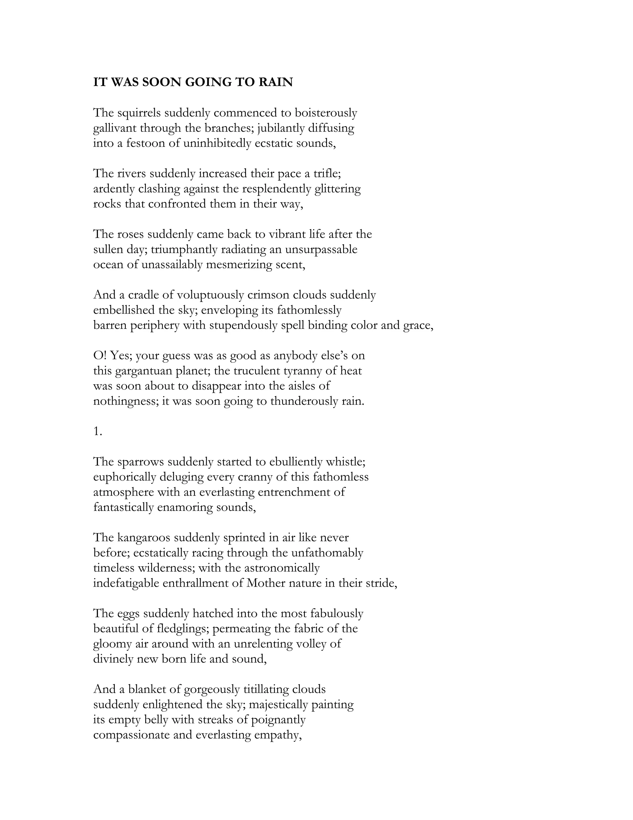 The passage describes how nature comes alive just before it begins to rain. Animals and plants spring into motion and sound, the sky fills with colorful clouds, and the oppressive heat is about to break. In each section, different elements of nature suddenly change or new phenomena appear in the sky, signaling that rain is imminent. The writing uses elaborate and flowery language to convey a sense of excitement and relief at the coming rain.