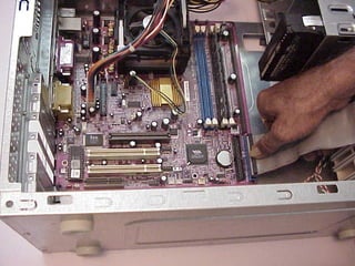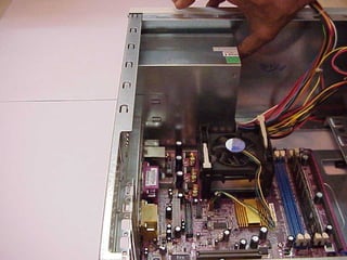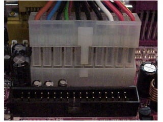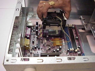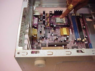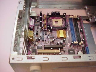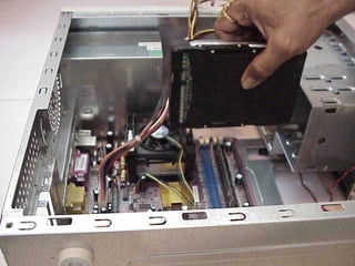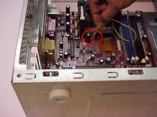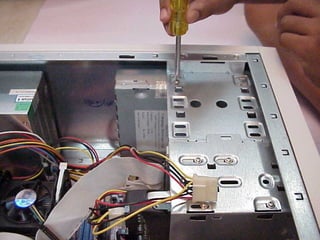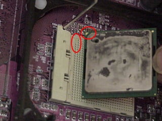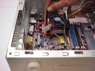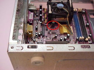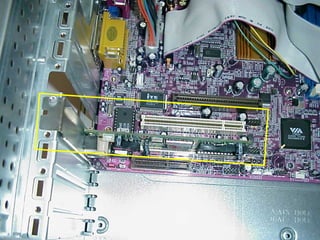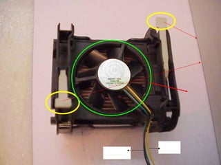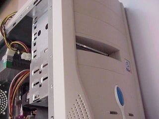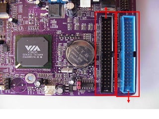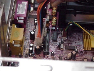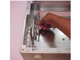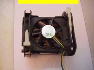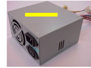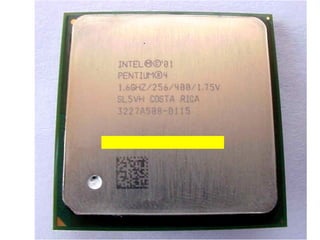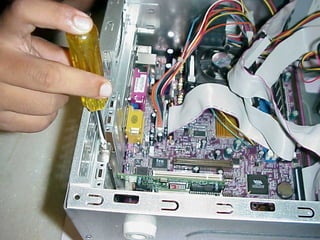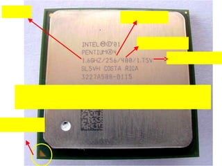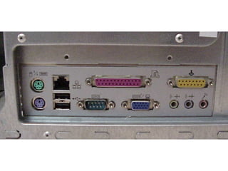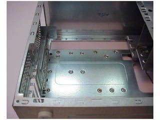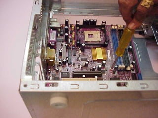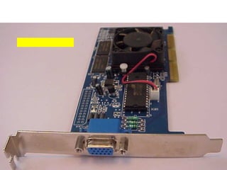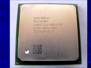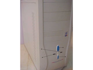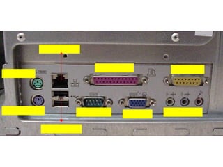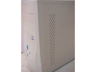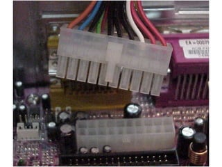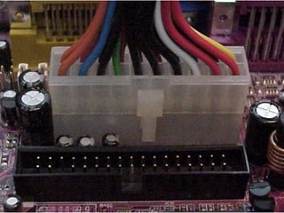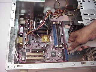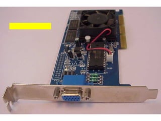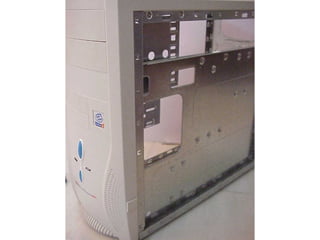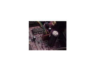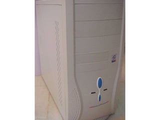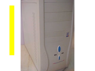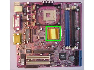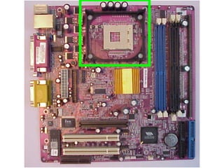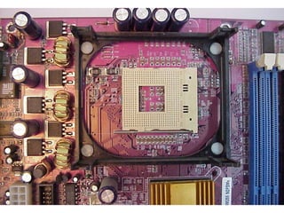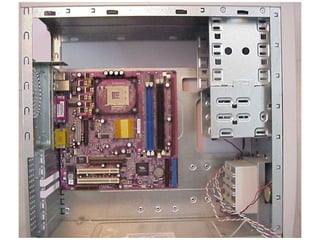 This document provides an overview of the key components of a computer, including the motherboard, CPU, RAM, hard drive, optical drives, expansion cards, ports, and power supply. It describes each component's purpose and specifications. Sections cover the motherboard in detail, explaining its sockets, bridges, slots, battery, and connectors that interface with other parts.