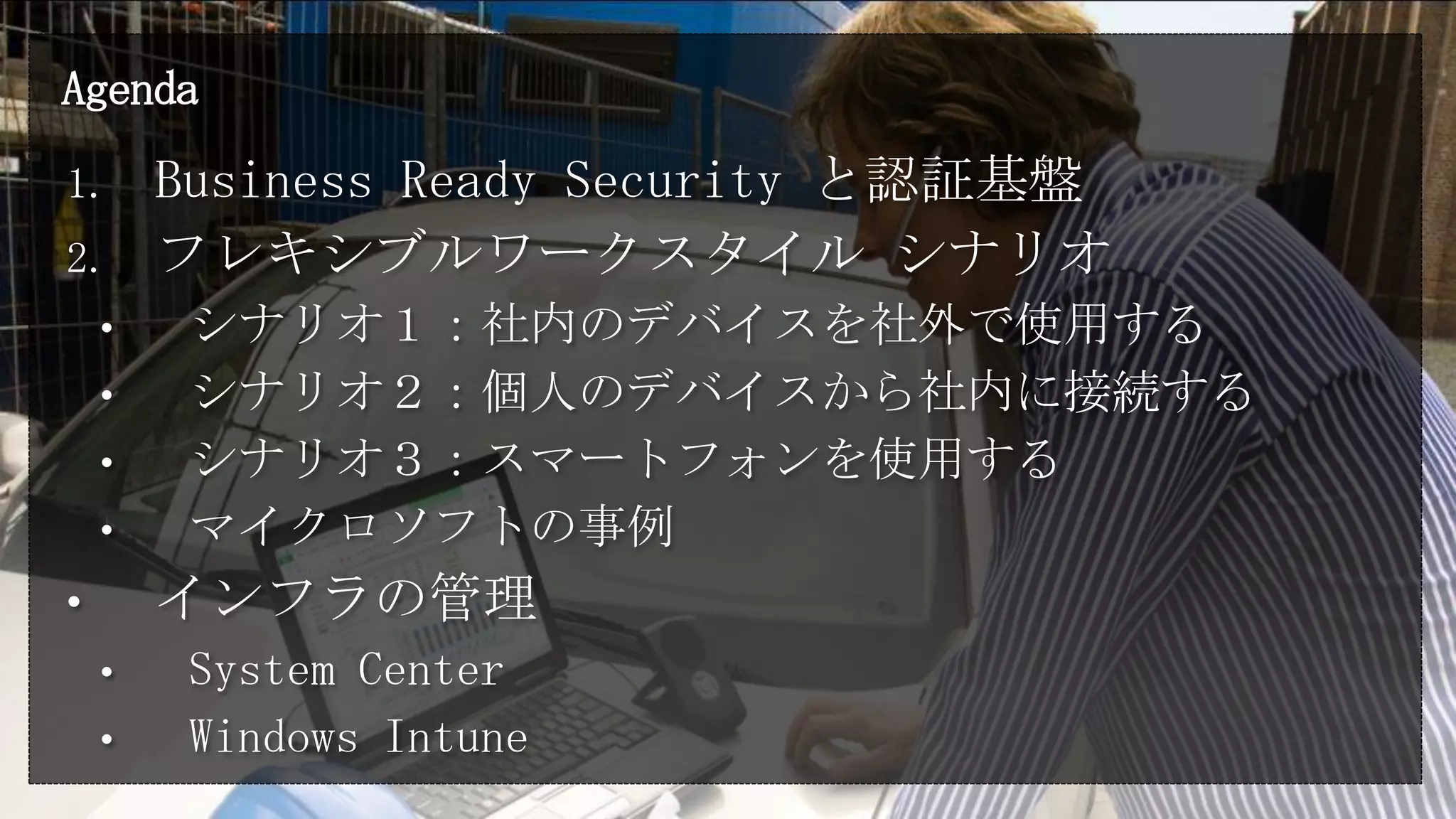 Editor's Notes #5 Business Ready Security とは、ビジネスの拡大にはセキュリティの管理が不可欠であるという考え方です。セキュリティが管理されたITというのは、利用者の自由を抑えるものではありません。逆に、利用者に対して自由度をあたることができます。つまり、利用環境が向上するわけですね。逆の言い方をすれば、セキュリティによって自由を抑制する方向に向かっているとしたら、そのセキュリティは正しくないと考えるべきです。セキュリティによって安全になったからといって、仕事がやりずらくなっては意味がないわけです。<クリック>我々は、セキュリティは「保護」「アクセス」「管理」という3つの要素から成るととらえています。<クリック>これらはユーザーIDを中心として構成することで、統合性が高く、安全で、相互運用可能なプラットフォームを構築することができます。では、このIDと、密接に統合された3つの要素により何が実現できるのか?<クリック>1つは、全社レベルでのセキュリティポリシーの統合と、末端までの浸透です。一部のシステムでセキュリティレベルが高くても意味がありません。末端まで浸透させてこそセキュリティのメリットを享受できます。<クリック>2つ目が、「全てを保護して、どこからでもアクセスができる」。そのためには、複数のレイヤーをまたがって保護することができなければなりません。複数のレイヤーとはすなわち、「ネットワーク」「コンピューター」「情報」「アプリケーション」です。保護に例外を設けてはいけません。一切のレイヤーが保護されていることで、はじめて、自由なアクセスを許可できるようになります。<クリック>3つ目に「セキュリティとコンプライアンスの管理がシンプル」になります。操作が複雑であったり、手作業が多いと、それは絶対に守られませんし、例外も発生しやすくなります。シンプルであることが、確実な管理の大前提であると認識する必要があります。 #8 このBusiness Ready Security を実現するために、マイクロソフトは6つ中心的なソリューションを提供しています。・1つは情報の保護。これは、コンピュータに保存されている機密情報が故意にしろ過失にしろ、漏えいしないようにするソリューションです。「漏えいしない」というのは、社内に留めておけばよいのか?いえいえ、それだけでは不十分なんです。社外に持ち出されても「読めない」「印刷できない」、ここまで行えないといけません。このソリューションの面白いところは、大量のデータにうずもれた機密情報を、自動的に発見するといったソリューションも含まれています。例えば、個人情報が知らずに書かれているドキュメントを発見するなんてことが可能です。・2つ目がメッセージの保護。電子メールというのは、情報漏えい手段の筆頭です。社外秘を添付して、簡単に外部に送ることができてしまいます。もちろん、故意だけでなく過失の場合もありますから、システムでしっかり監視し、漏えいするまえにフィルターする必要があるわけです。万が一漏えいしてしまったとしても、「情報の保護」ソリューションのように、読めないような仕組みが必要です。・3つ目が安全なコラボレーション。コラボレーションとは、社外パートナー企業との協業のことです。社外のユーザーを社内システムにアクセスさせるのはとても面倒ですし、気を使います。おそらく、大くの企業では実現していないはずです。このソリューションでは、Federationという技術を活用することで、社外ユーザーのユーザーIDを自身の企業で管理することなく、安全にアクセス権を与えることができます。クレーム認証という認証方式を使用しています。・4つ目がクライアント保護。真っ先に思いつくのがウィルスチェックやWindows Updateですね。ただ、それをクライアント単体で実装しているだけでは不十分なのです。企業全体のセキュリティポリシーに合致しているかどうかをチェックし、万が一チェックしていないPCがあったとしたら、即座にネットワークから切り離して検疫するといったことが可能でなければなりません。ほかにも、ハードディスクが暗号化されているか、使ってはいけない危険なアプリケーションを使っていないか、アクセスしてはいけないWEBサイトにアクセスしていないか、想定される一切の危険からクライアントを保護できる必要があります。USBメモリーを使わせない、USBメモリーを強制的に暗号化させるといったソリューションも用意されています。・5つめが統合セキュリティ。ここまでの4つのソリューションを個別のアプリケーションで管理していたのでは、管理者に大きな負荷がかかってしまいます。また、セキュリティポリシーというのは個々のレイヤーで個別に管理するのではなく、すべてのレイヤーで統一されている必要があります。それができなければ、たとえば、クライアントがウィルスに感染したからといって、クライアントをネ