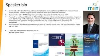 Charlie Betz, a director of strategy and innovation at a major US telecom and ecommerce provider, discusses the IT4IT framework, an open standard for managing the 'business of IT' designed to enhance enterprise IT governance and operational efficiency. The framework emphasizes integrating end-to-end IT value streams and aims to provide an architectural reference that supports various IT management processes, contrasting with existing models like ITIL and COBIT. The document outlines key components of the IT4IT reference architecture and its focus on real-world use cases to drive business innovation through improved IT service delivery.