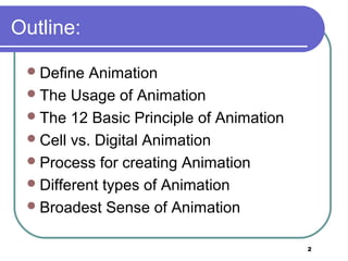 Animation is defined as a collection of static images shown sequentially to create the illusion of movement. There are two main types: cell animation which uses transparent sheets for hand-drawn frames, and digital animation which uses computer software. The 12 principles of animation like timing, follow through, and anticipation are used to make the movements appear natural. The animation process involves planning with storyboards and then implementing the frames through techniques like cel, claymation, CGI or stop motion. Animation is used for entertainment, visualization, and instruction and can be categorized as 2D, 3D or stop motion.
