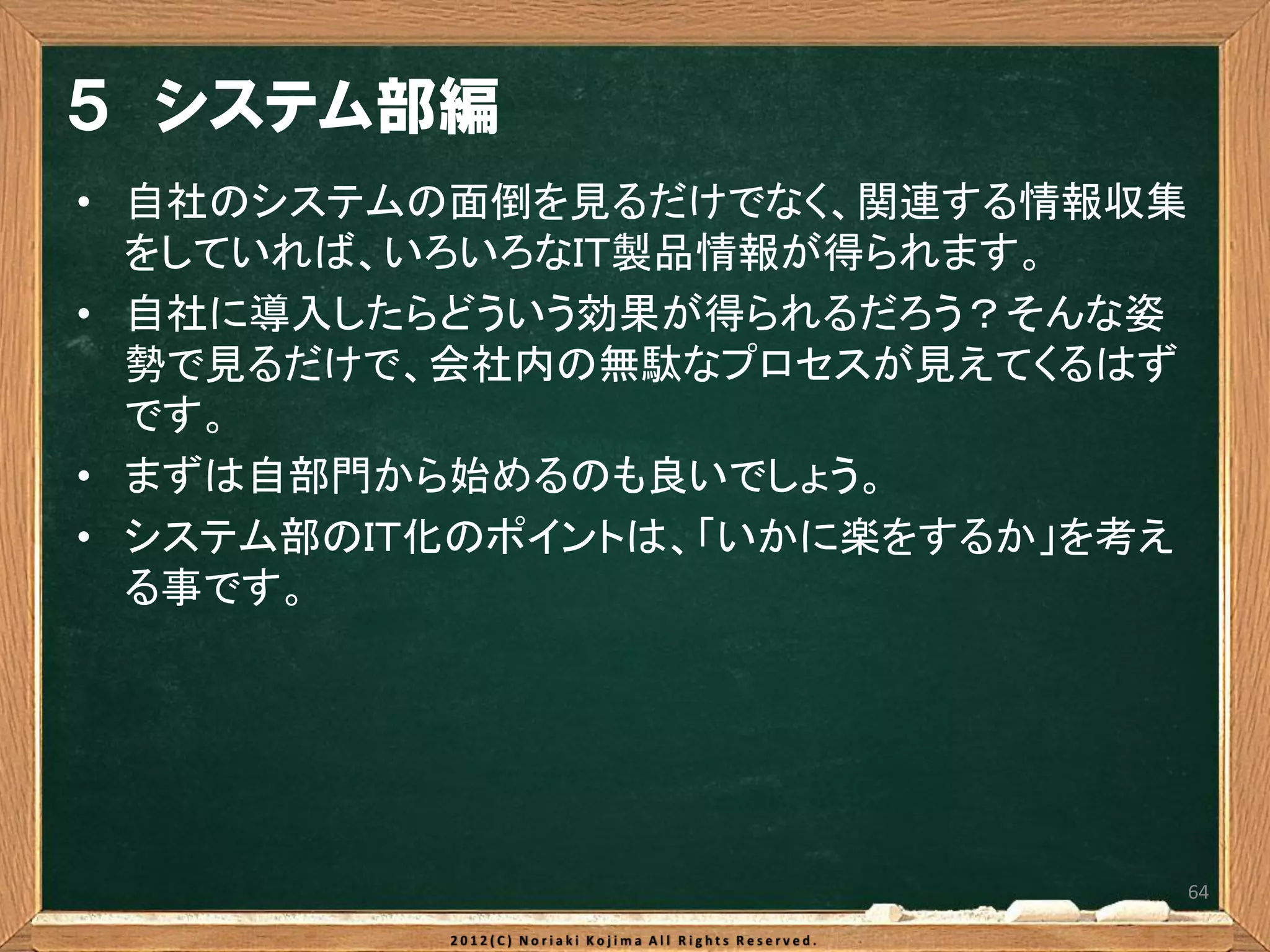 をしていれば、いろいろなIT製品情報が得られます。 • 自社に導入したらどういう効果が得られるだろう?そんな姿 勢で見るだけで、会社内の無駄なプロセスが見えてくるはず です。 • まずは自部門から始めるのも良いでしょう。 • システム部のIT化のポイントは、「いかに楽をするか」を考え る事です。 64