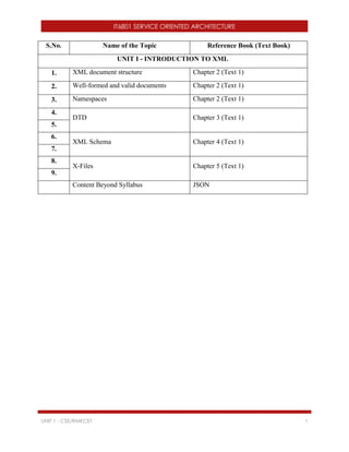 This document outlines the objectives and content of the IT6801 Service Oriented Architecture course. The course aims to teach students XML fundamentals, building XML-based applications, understanding service oriented architecture principles, web services technology elements, and building SOA-based applications. The course contains 5 units that cover topics like XML document structure, XML schemas, SOA characteristics, web service standards, and composing SOA applications. Students will learn to build applications based on XML, develop web services, and create SOA solutions for enterprise applications.