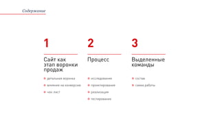 Документ описывает подход к проектированию и дизайну сайтов как этапа воронки продаж с акцентом на влияние конверсии. Он включает в себя исследования, проектирование, реализацию и тестирование, предлагая конкретные примеры и взаимодействия с пользователем для повышения конверсии. В заключение подчеркивается важность выделенных команд и управления проектом для успешного достижения целей.