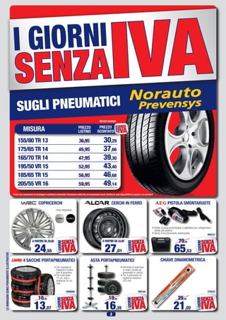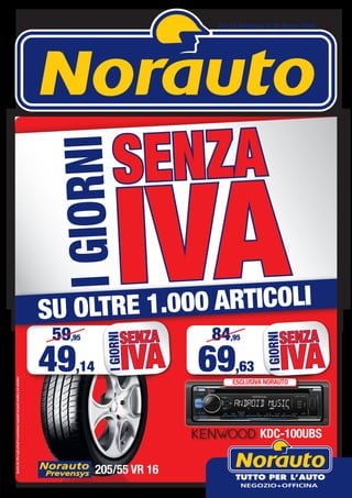 Il documento presenta una promozione di Norauto con sconti del 18% su oltre 1.000 articoli tra cui pneumatici, accessori per auto e moto, e prodotti per la cura del veicolo. Le offerte sono valide dal 15 febbraio al 20 marzo 2016 e comprendono una varietà di articoli a prezzi scontati, escludendo i costi di montaggio e altri contributi. Viene inoltre evidenziata l'importanza di verificare la disponibilità in negozio e online.