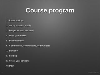 This document provides an overview of an Italian startups course. It includes an agenda that covers topics like what is a startup, how to create and work on one, successful Italian startups like Buongiorno and Yoox, and startup failures. Case studies are presented on startups such as Buongiorno, Yoox, Volagratis, Jobrapido, and Glancee. The document also discusses Italian companies like Arduino, Moleskine, and unsuccessful ventures like Webvan.