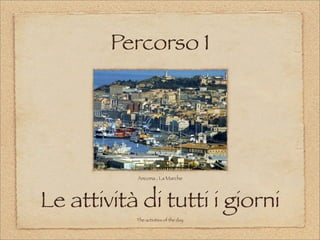 Il documento descrive le attività quotidiane di vari soggetti, fornendo vocaboli e frasi utili per la conversazione in italiano. Vengono anche introdotte le regole per esprimere l'ora e i verbi riflessivi. Inoltre, il testo include informazioni sulla regione Marche, evidenziando la sua storia e le sue industrie.