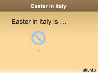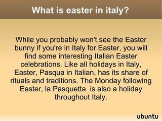 Easter in Italy involves several religious traditions and celebrations. Solemn religious processions are held on Good Friday or Holy Saturday in many towns, and sometimes on Easter Sunday as well. Italians also celebrate Pasquetta, the Monday after Easter, as a holiday with more joyous celebrations after the solemnity of Holy Week. Rituals like parading statues of Jesus or the Virgin Mary through cities while participants wear traditional costumes are also part of Easter observances in Italy.