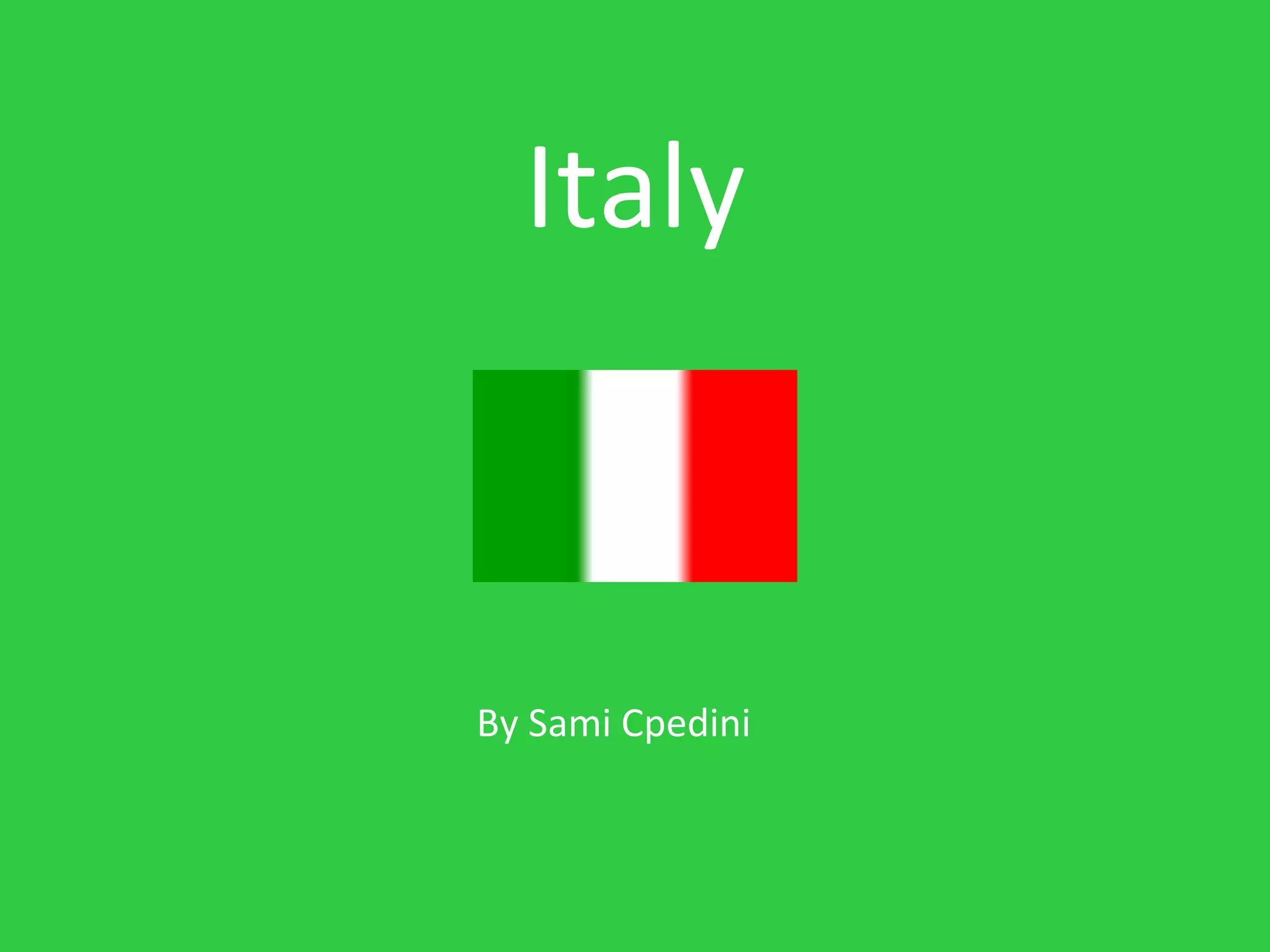 Italy is located in southern Europe, shaped like a boot, surrounded by the Mediterranean Sea. It is divided into 20 provinces and contains mountain ranges like the Alps and Apennines. Major lakes include Lake Garda, Lake Maggiore, and Lake Como, and rivers include the Po, Adige, and Arno. Italy has a long history dating back to ancient settlers and was once part of a large Roman Empire, leaving behind famous buildings like the Coliseum. The Renaissance began in Italian city-states, and Italy is now a republic known for its art, food, landmarks, and cars like Ferrari.