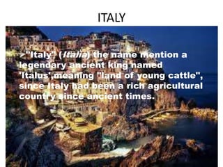Italy is a country located in southern Europe, bordered by France, Switzerland, Austria, and Slovenia. Italy has a long history, originally being home to the powerful Roman Empire. Though it faced periods of foreign domination and broke into smaller states, Italy eventually unified in the 19th century and is now a democratic republic. Italian culture is rich with traditions like Carnival celebrations and national holidays. The country is also famous for foods like pizza, gelato, and tiramisu, and has spectacular architecture such as the Colosseum and canals of Venice.