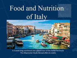 This 3-week study abroad program in Italy focuses on food and nutrition. Students will spend 19 nights in several Italian cities including Rome, Siena, Florence, Bologna, Verona, and Venice. The program includes 12 academic excursions, 11 cultural excursions, and guided tours of major sites. Students will visit food producers, take cooking classes, and sample regional specialties. They will learn about pasta, cheese, meats, wine, olive oil, rice, and balsamic vinegar while touring factories and mills. The detailed itinerary outlines daily activities, meals, transportation, and destinations for the 3-week experience.