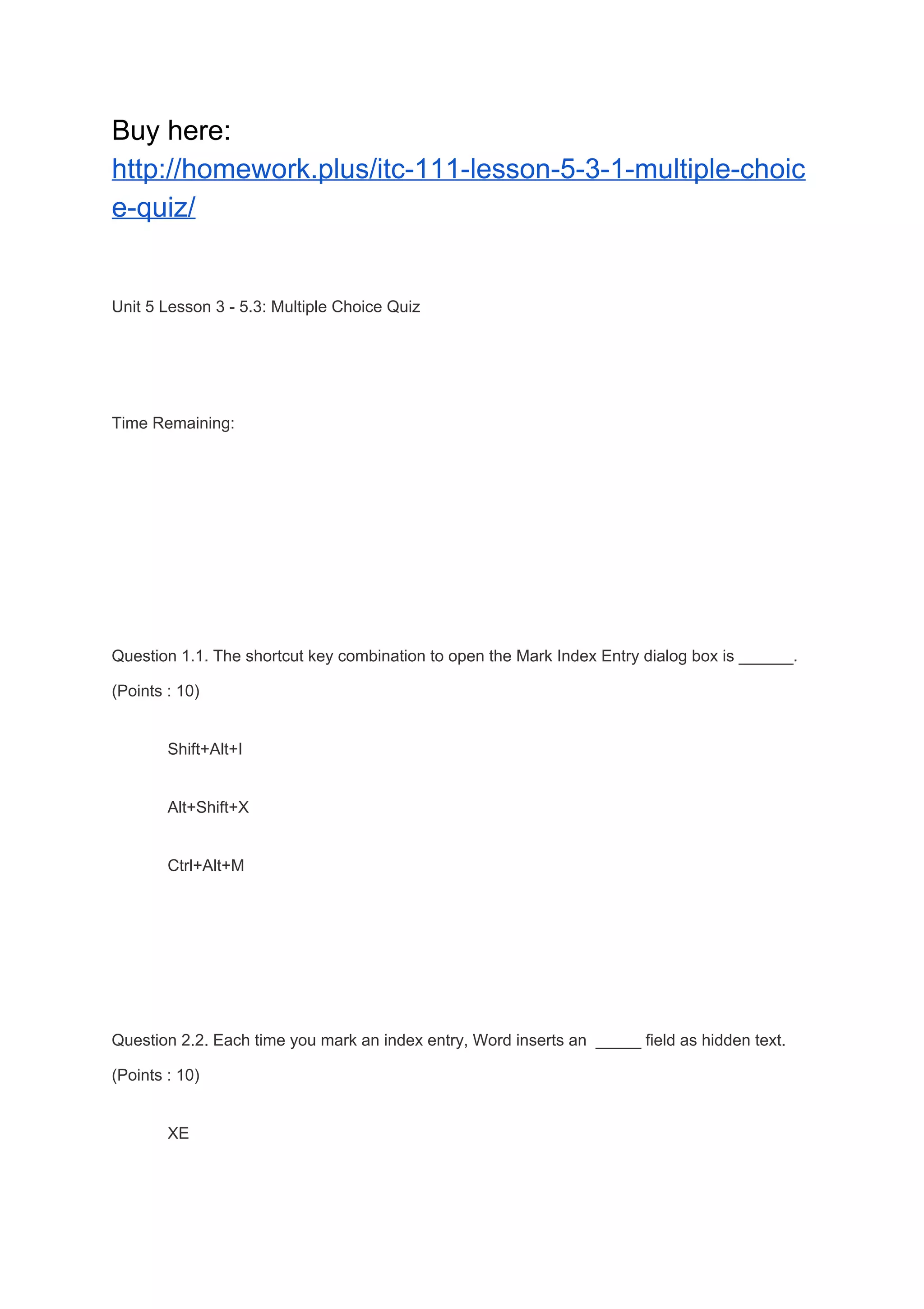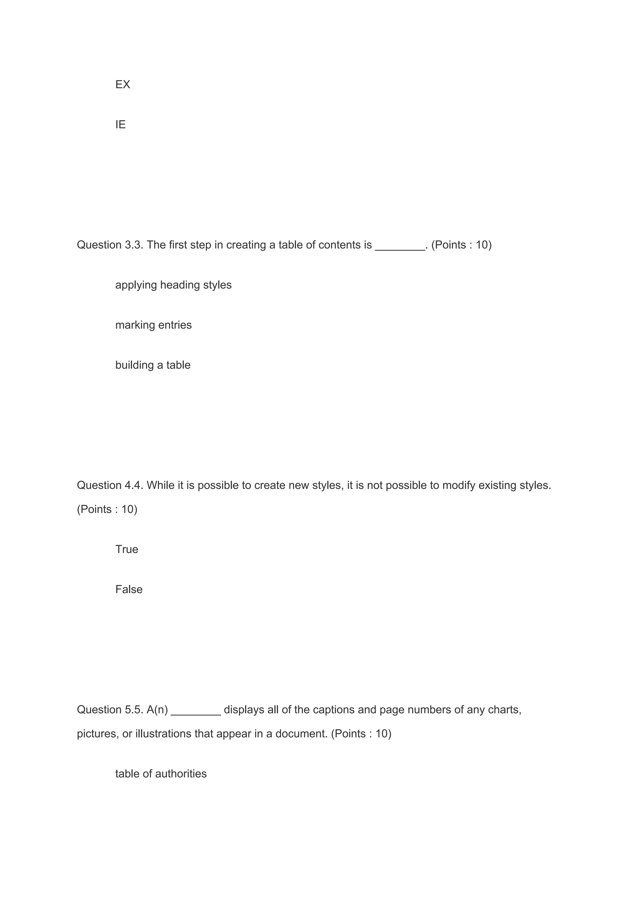 This document provides a 10 question multiple choice quiz on Word features related to indexes, tables of contents, tables of figures, bookmarks, footnotes, and endnotes. The questions test knowledge of shortcut keys to insert index entries, fields used for indexes, the first step for creating a table of contents, whether styles can be modified, what a table of figures displays, the first step for creating a table of figures, what a table of authorities lists, what a reference tag is, whether spaces can be used in bookmark names, and what is most commonly used for citations.