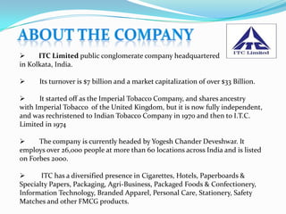 ITC Limited is a large Indian conglomerate headquartered in Kolkata, with a diverse portfolio including cigarettes, hotels, paper, packaging, agriculture, food and beverages, IT, and personal care. It has a presence in over 60 locations across India and employs over 26,000 people. The company aims to be carbon positive, water positive and solid waste recycling positive. ITC has created sustainable livelihoods for over 5 million people in rural India. The company has diversified from its origins as a tobacco company into a multi-product corporation through strategic brand building, R&D, packaging and distribution capabilities.