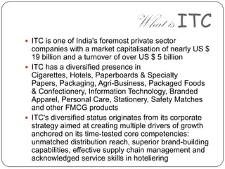 ITC is one of India's largest private sector companies with a diverse portfolio including cigarettes, hotels, food, personal care, and more. It has a deep distribution network of manufacturers, distributors, wholesalers, retailers, and paanwalas to ensure its products reach both urban and rural consumers. ITC selects distributors based on their infrastructure and population coverage. Distributors are expected to stock all ITC FMCG products except stationery. ITC leverages its established distribution network for cigarettes to also sell complementary products like matches and expand into new categories like biscuits.