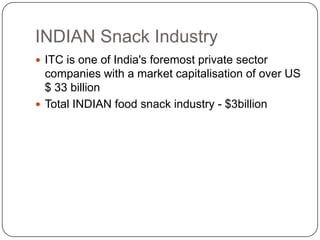 ITC is a large private company in India with a market capitalization over $33 billion. The total Indian snack food industry is worth $3 billion. ITC is a major player in the Indian snack food industry.