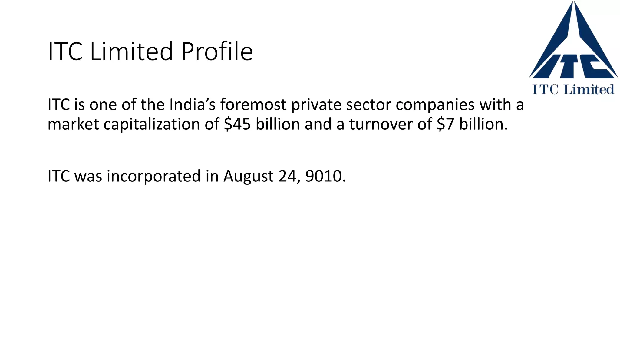 ITC Limited is one of India's largest private sector companies with a market capitalization of $45 billion and annual turnover of $7 billion. The company was incorporated in 1910 and has created multiple drivers of growth through diversification across industries including cigarettes, hotels, paper, agri, and information technology. ITC's financial analysis shows a return on equity of 33% with earnings per share of 11.3 rupees and dividend payout ratio of 44% for the fiscal year. Recent news reports indicate the government may impose stricter regulations on tobacco sales and smoking in public, which could negatively impact ITC and other cigarette companies.