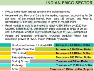 The Indian FMCG sector, valued at approximately USD 7 billion for major companies like Hindustan Unilever and ITC, is experiencing significant growth, driven by rising income levels and expanded rural markets. Households and personal care dominate the market, while challenges include low export levels and stringent government regulations. The sector is expected to reach a retail market valuation of USD 1 trillion by 2020, with organization reforms benefiting established players.