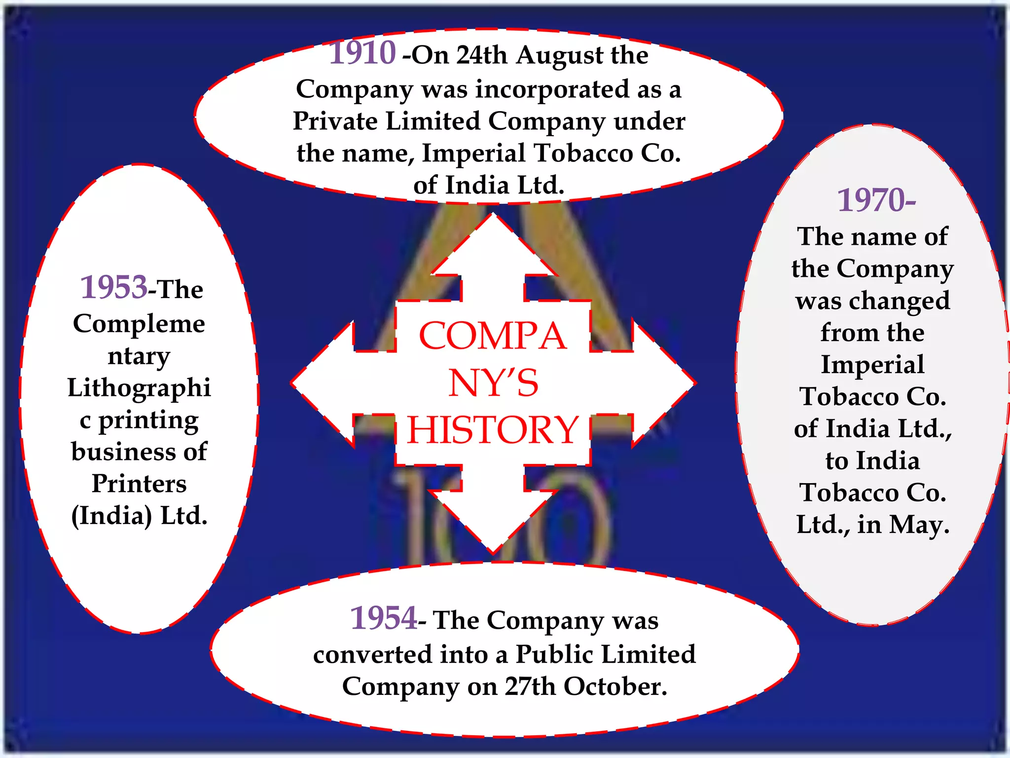 ITC was incorporated in 1910 as Imperial Tobacco Company of India Ltd. and over the decades diversified into various business segments like hotels, paperboards, FMCG foods etc. to become one of India's most valuable corporations. Some key events include changing its name to India Tobacco Co. Ltd. in 1970, converting to a public limited company in 1954, launching refined mustard oil under Real Gold brand in 1990, starting agarbatti brands in 2003-2005, and launching shampoo and fairness cream brands in 2009-2010. ITC aims to sustain its position through world class performance and delivering superior stakeholder value across its business portfolio including cigarettes, hotels, agri, paperboards and FMCG foods.