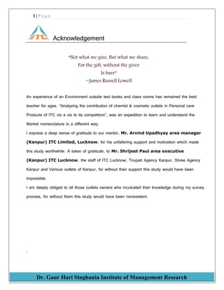The document is a summer training report analyzing the contribution of chemist and cosmetic outlets to ITC's personal care products versus competitors. It focuses on visual merchandising, customer behavior, and the effectiveness of company promoters in influencing sales. The study utilized surveys and interviews from various outlets in Kanpur, concluding with recommendations and insights on market dynamics.