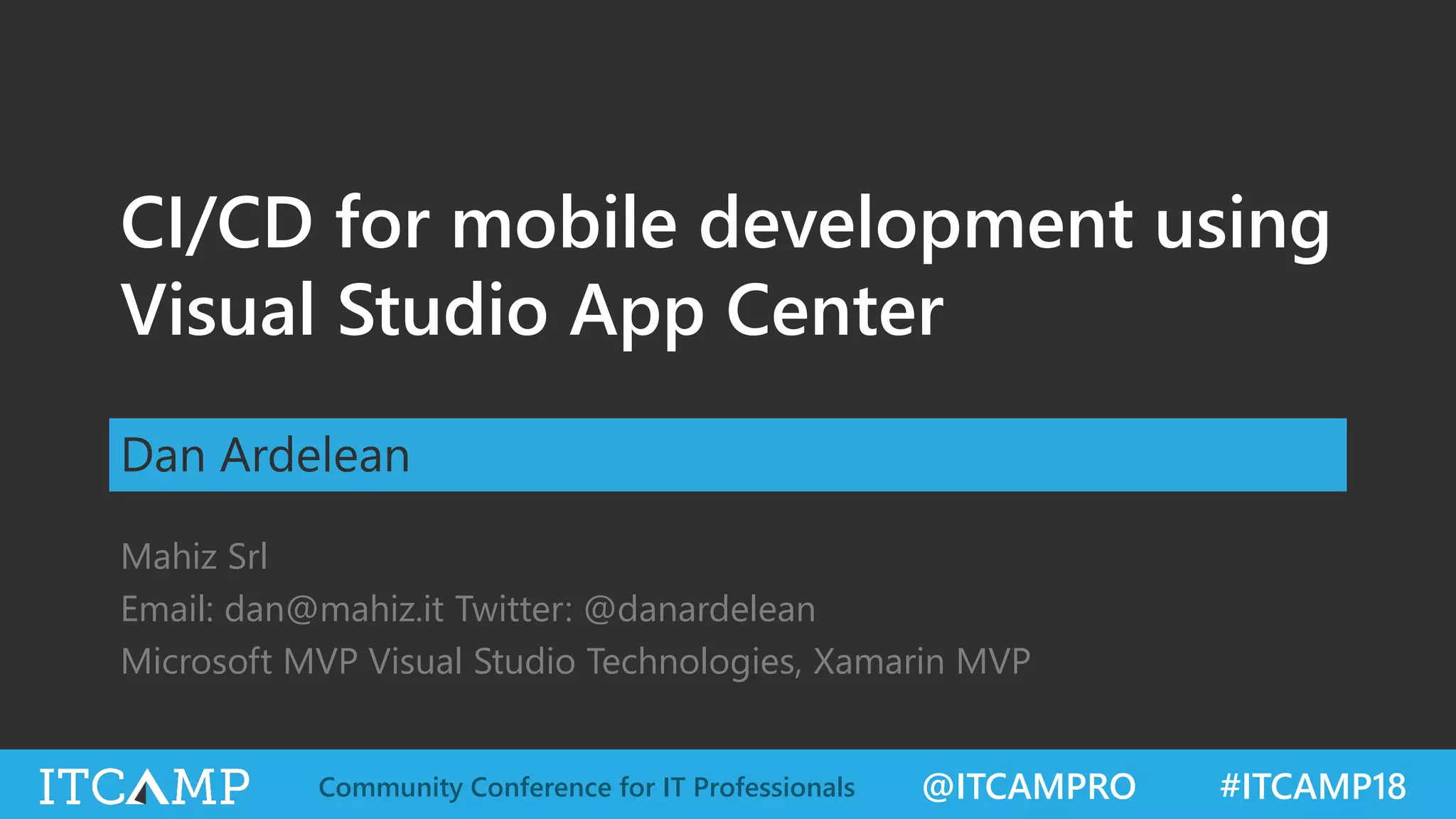 The document discusses the ITCamp conference focused on CI/CD for mobile development using Visual Studio App Center, featuring speaker Dan Ardelean. Key topics include the app delivery lifecycle, testing across different OS versions, and integrating CI/CD pipelines. The App Center offers various tools for building, distributing, testing, and analyzing mobile applications efficiently.
