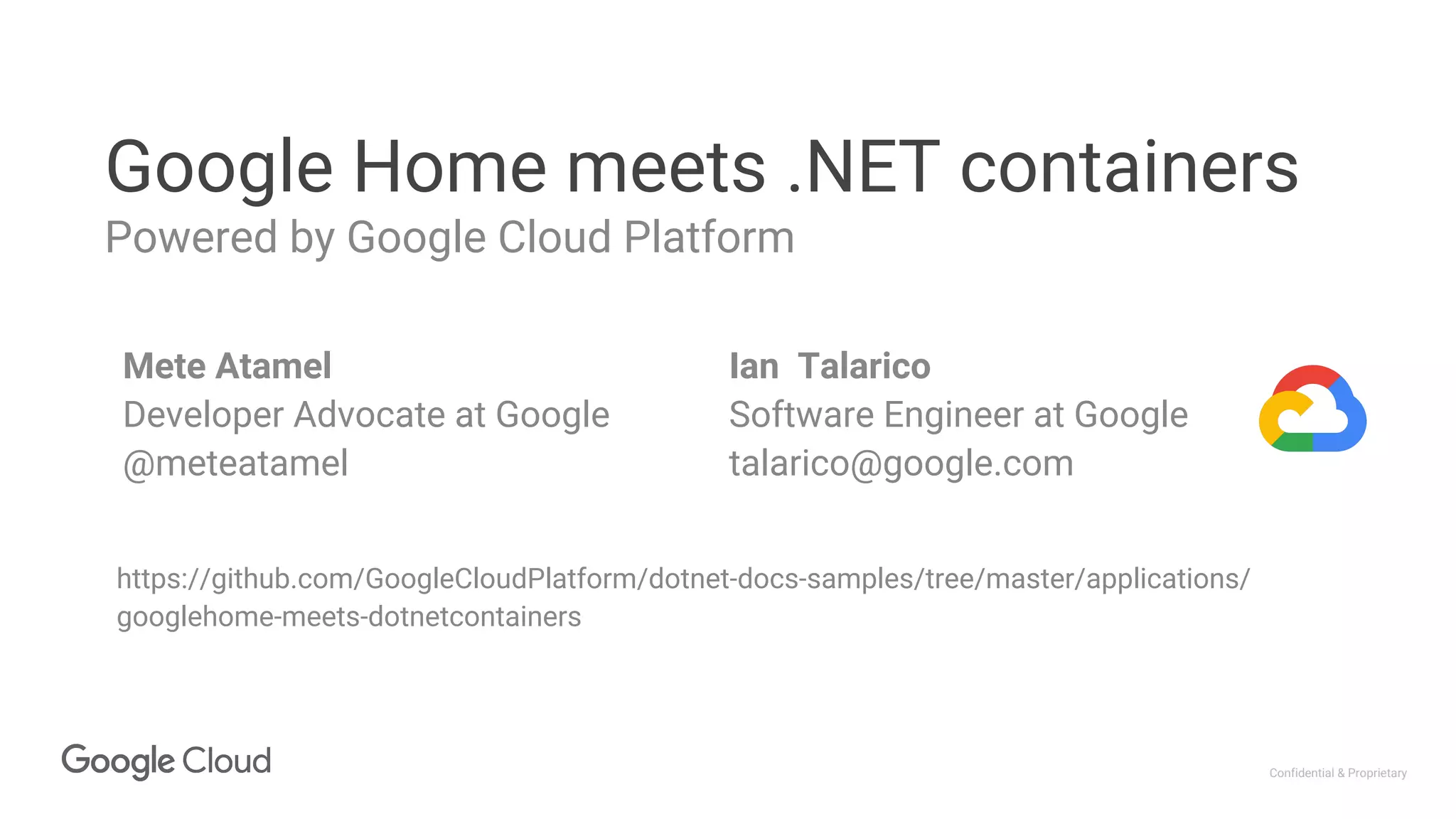 The document outlines the integration of Google Home with .NET containers on the Google Cloud Platform, highlighting the use of ASP.NET Core, Google Assistant, Dialogflow, and various Google Cloud services. It emphasizes the benefits of containerization, deployment options, and the capabilities of Kubernetes for managing applications. The content is geared towards developers, including resources for building conversational experiences and using Google's machine learning APIs.