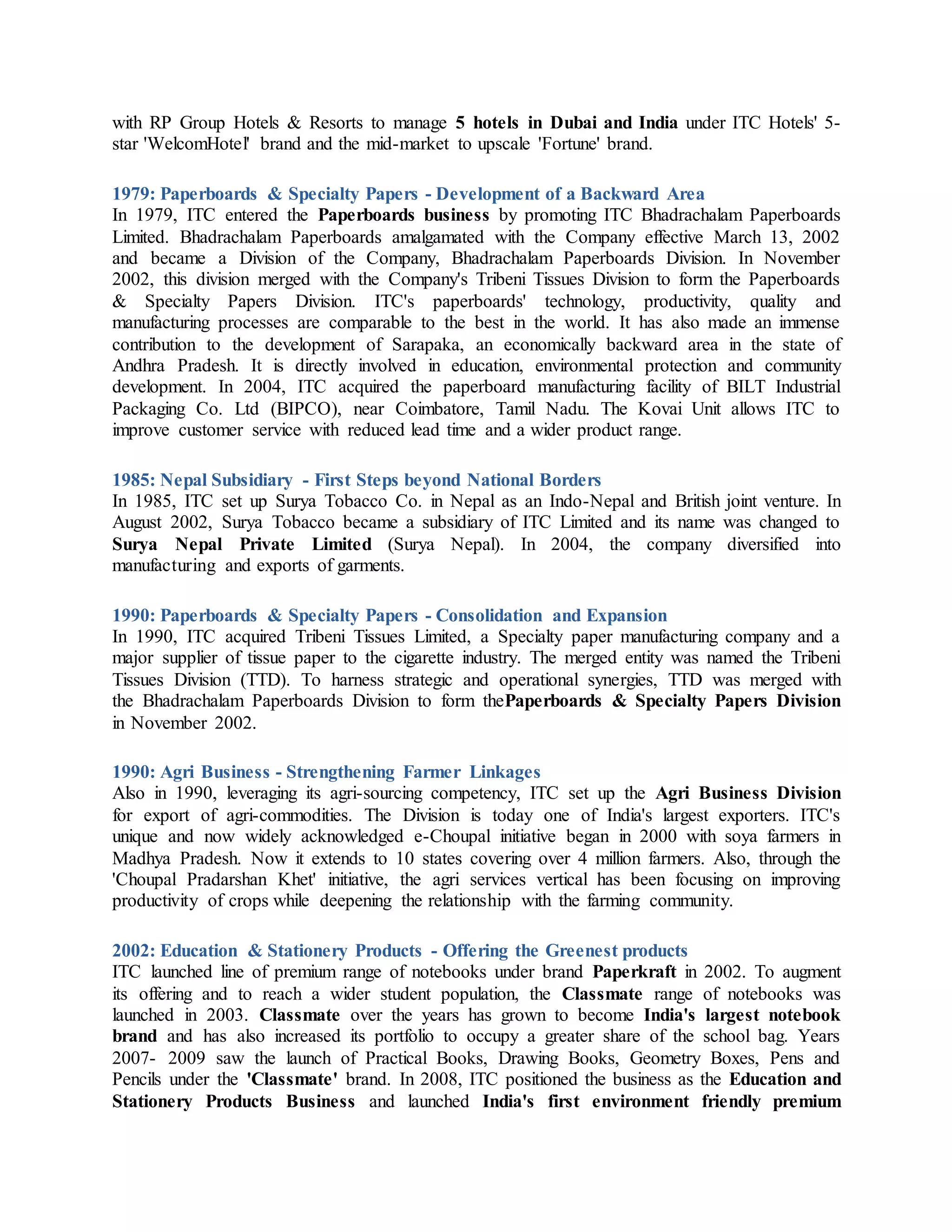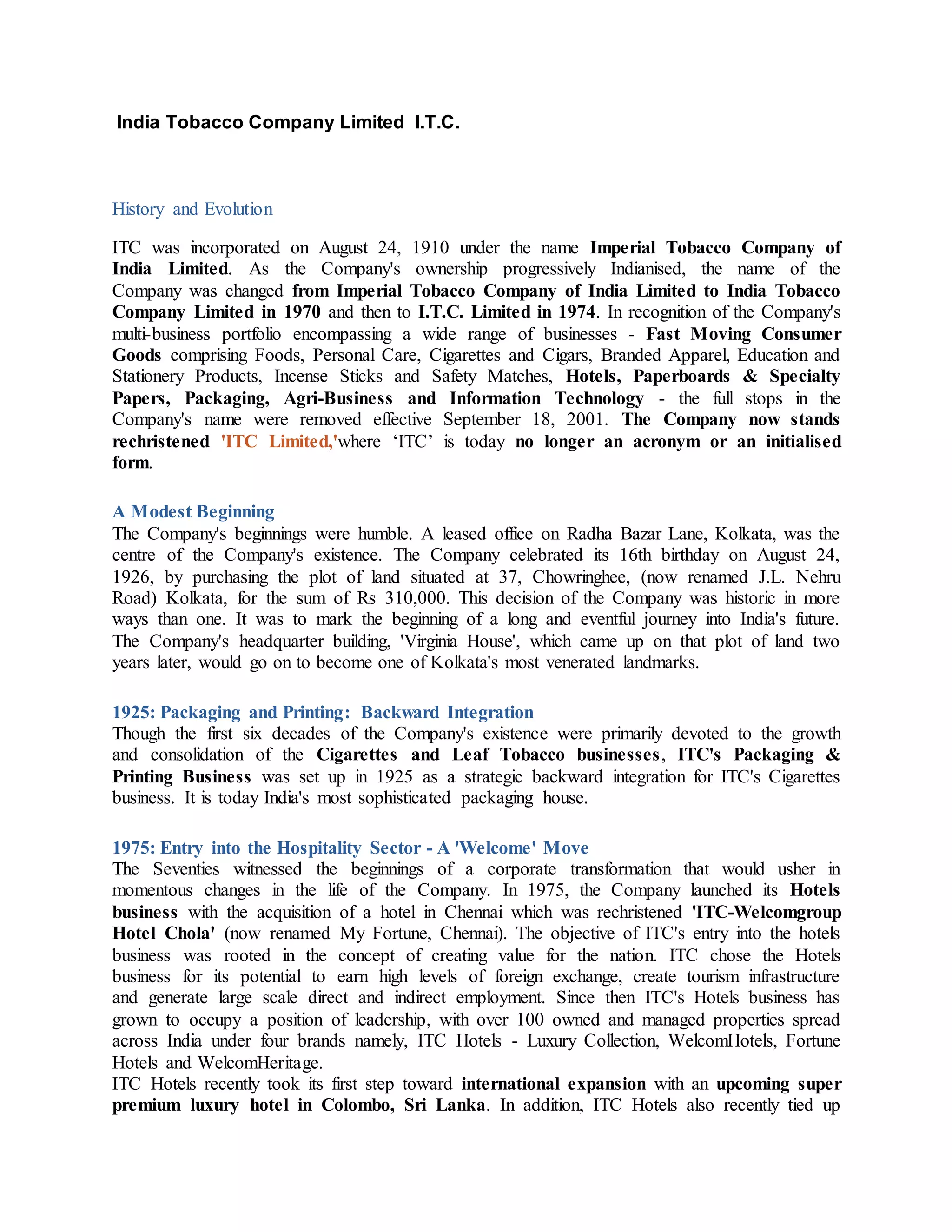 ITC was incorporated in 1910 as Imperial Tobacco Company of India and over time diversified into multiple businesses including packaging, hotels, paperboards, agri-business, education/stationery, lifestyle retailing, IT, foods, agarbattis, matches and personal care. Some key developments included starting a packaging business in 1925, entering hotels in 1975, paperboards in 1979, setting up a Nepal subsidiary in 1985, and launching food brands starting in 2001 which have grown significantly. ITC now operates in multiple consumer product categories and sectors of the economy.