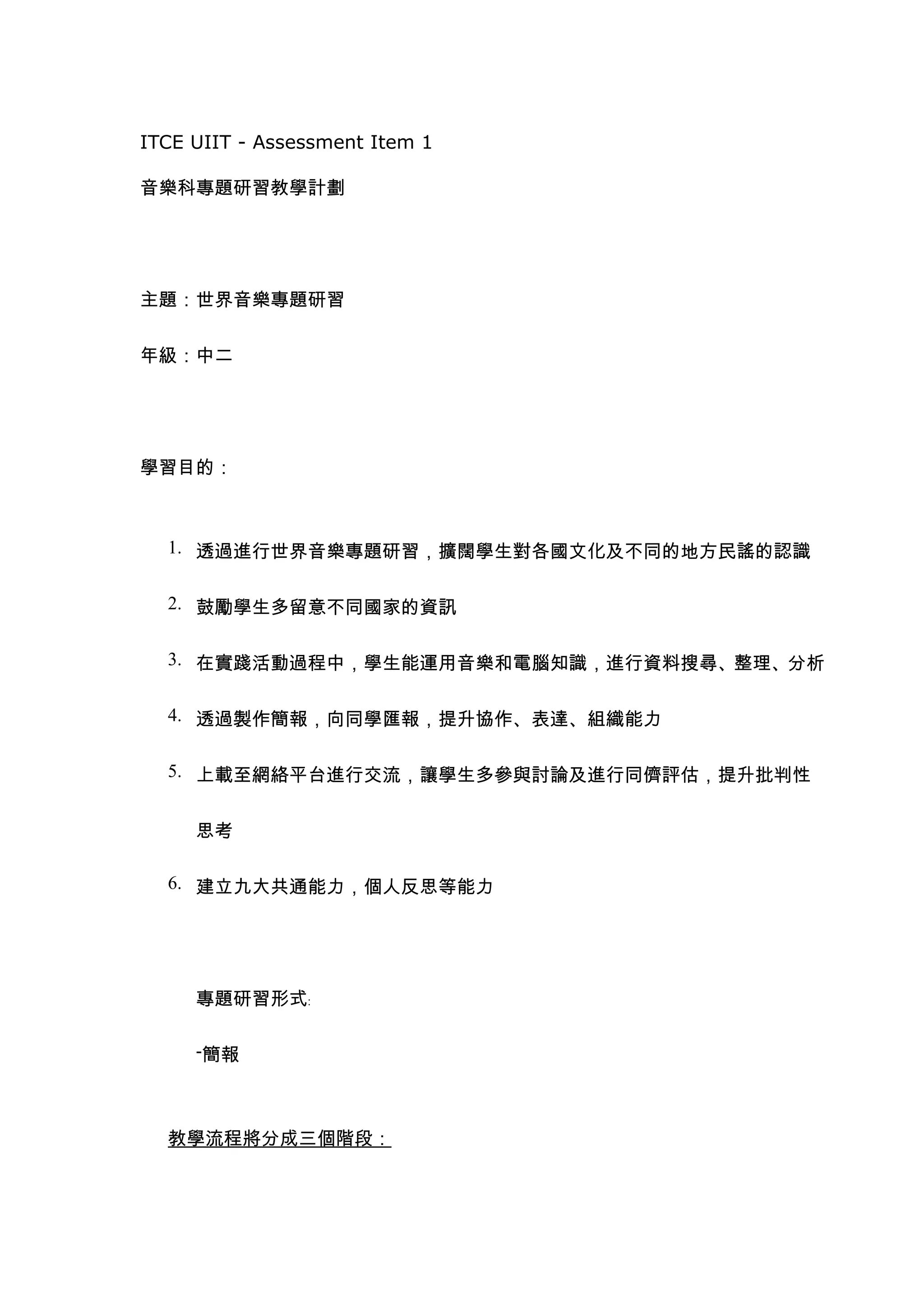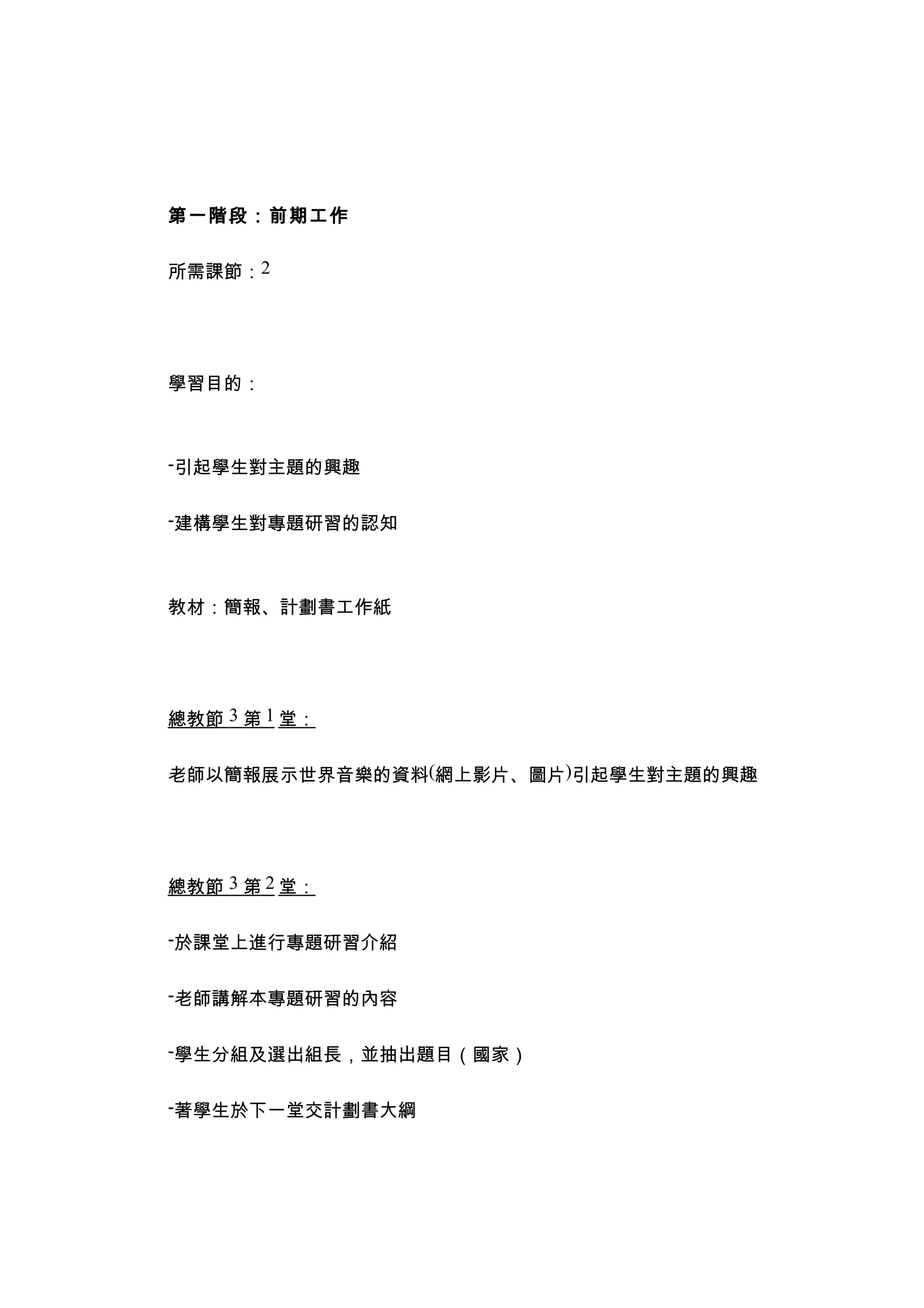 该文档介绍了中二年级的世界音乐专题研习教学计划,包括学习目的、教学流程及评价方式。通过信息技术的有效运用,鼓励学生对不同文化的探索与自主学习,提升其音乐技能与批判性思维。文中还反思了信息技术在教学中的应用及其带来的优势与挑战。
