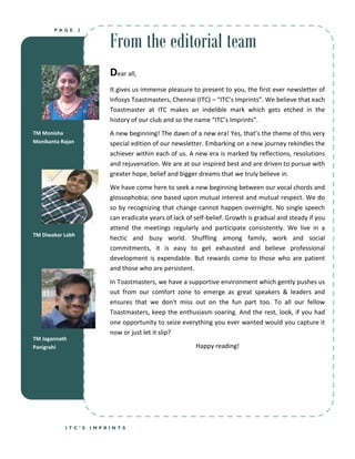 This document is the first newsletter of Infosys Toastmasters Club in Chennai titled "ITC's Imprints". It features articles from various Toastmasters leaders welcoming the new newsletter and wishing the club success. It also includes updates from club meetings and recognition of member achievements. The overall theme is about embarking on a new journey and pursuing goals with commitment.
