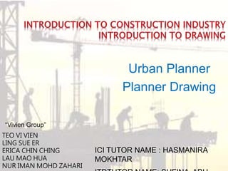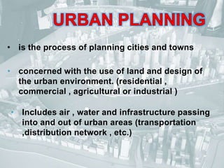 Urban planners are professionals who work with local authorities to plan the development of cities and towns. They consider issues like sustainability, pollution, traffic, and zoning codes. In the pre-construction stage, urban planners meet with developers and authorities, conduct research and analysis of the land, and submit development plans to local authorities for assessment and approval. This involves presenting options and identifying needed changes to ensure useful consultation before architects can begin design work.