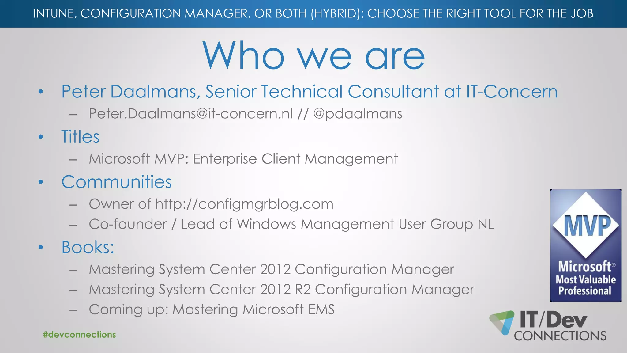 The document discusses the management tools available for Windows 10, specifically Microsoft Intune and System Center Configuration Manager (SCCM), including their pros and cons and strategies for effective deployment. It features insights from experts in the field, an agenda outlining key topics, and troubleshooting tips for managing devices. The discussion emphasizes the need for thoughtful tool selection based on organizational needs and user experience.
