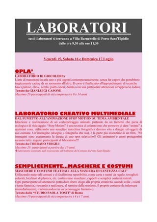 Il documento presenta il festival internazionale del teatro per ragazzi, fondato nel 1990, con eventi e laboratori programmati per il 2011 su vari temi artistici e creativi. I laboratori, che si svolgeranno a Porto Sant'Elpidio, sono progettati per diverse fasce d'età e comprendono attività come giocoleria, animazione stop motion e costruzione di maschere. La partecipazione è previa iscrizione con un costo di €10 per tre giorni.