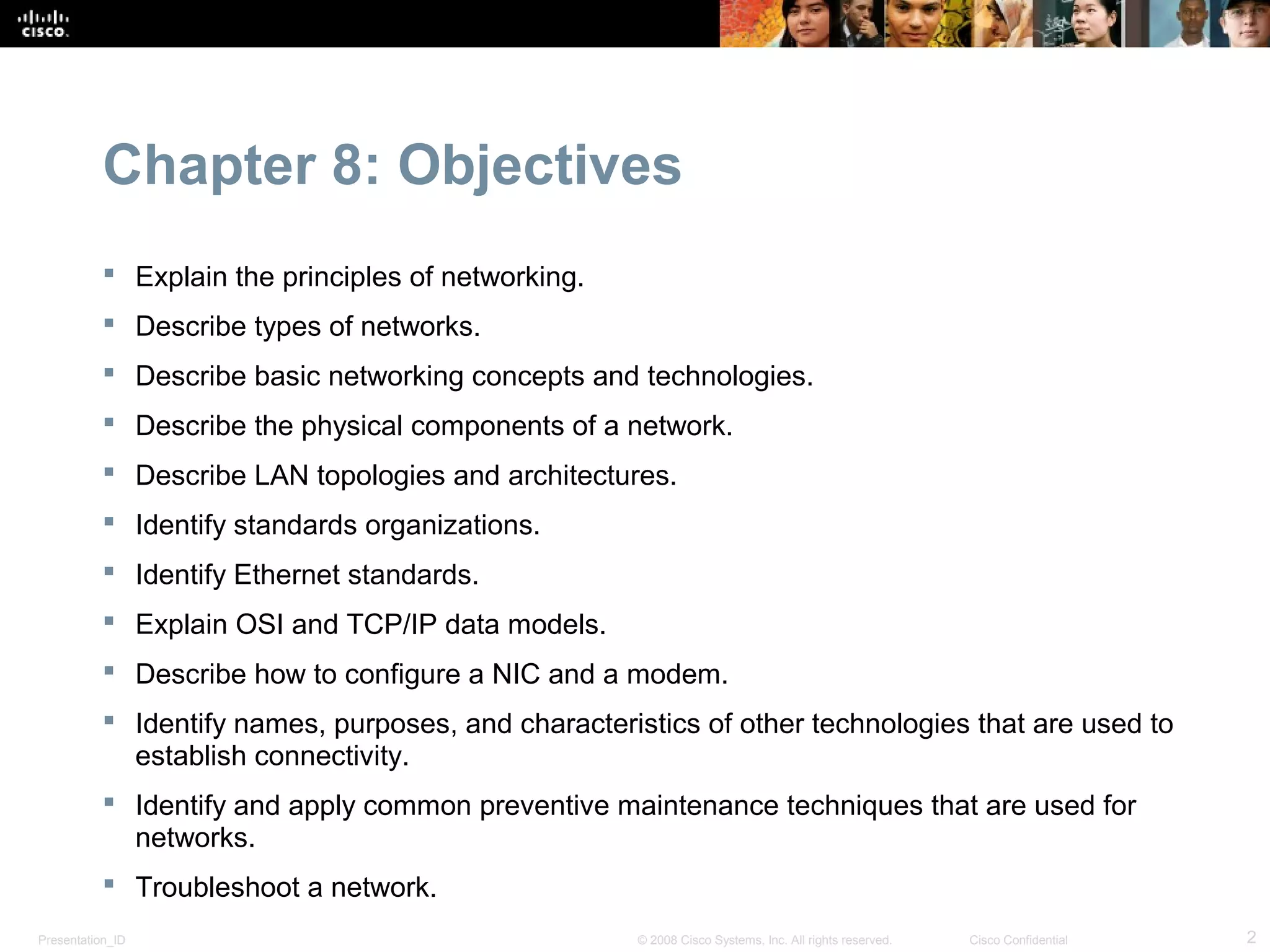 This chapter introduces fundamental networking concepts including networking principles, types of networks, networking components, LAN topologies, standards organizations, Ethernet standards, the OSI and TCP/IP models, configuring network interfaces, and network troubleshooting. It aims to provide students with the knowledge needed to install devices on a network and understand basic networking concepts. The chapter covers various networking terms and technologies and includes worksheets, labs, and Packet Tracer activities for students.